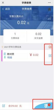 3 , 选择“学生缴费”,勾选要缴纳的项目, 然后点击下方支付。